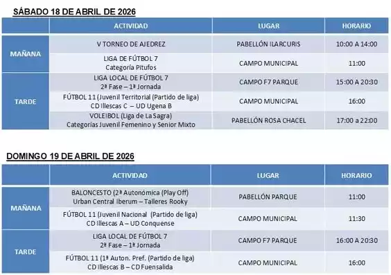 Este es el programa de actividades deportivas que tendran lugar en Illescas este fin de semana: el sabado 18  y el domingo 19 de abril