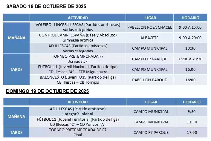 Programación deportiva en Illescas. Días 18 y 19 de Octubre