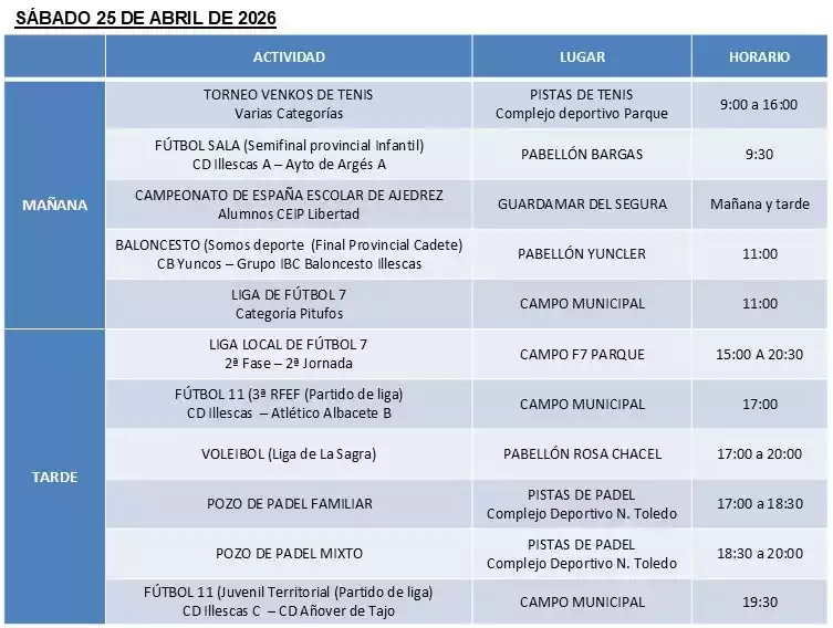 Este es el programa de actividades deportivas que tendran lugar en Illescas este fin de semana: el sabado 25 y domingo 26 de Abril