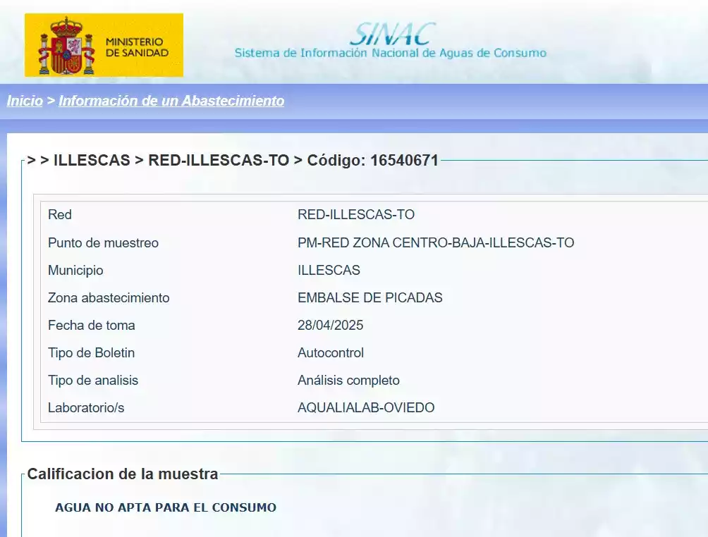 Existen dos boletines con números 16540671 y 16392422 emitidos por el SINAC (Sistema de Información Nacional de Aguas de Consumo), entidad dependiente del Ministerio de Sanidad. En dichos boletines se especifica claramente que la Calificación de la muestra indica «AGUA NO APTA PARA EL CONSUMO»