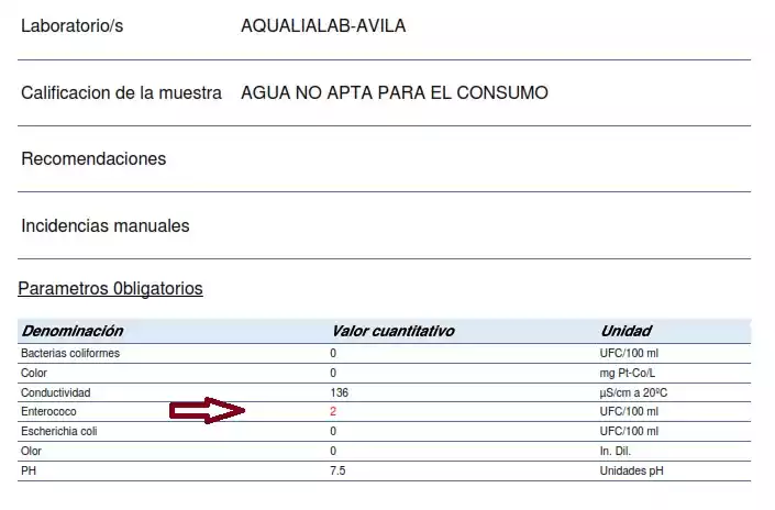 En dicho informe o boletín se indica que el valor obtenido en Enterococo es de 2 unidades UFC/100 ml, superando ampliamente el valor paramétrico que ha de ser 0. Es por esta medición por lo que se indica en el informe que el AGUA NO ES APTA PARA EL CONSUMO.
